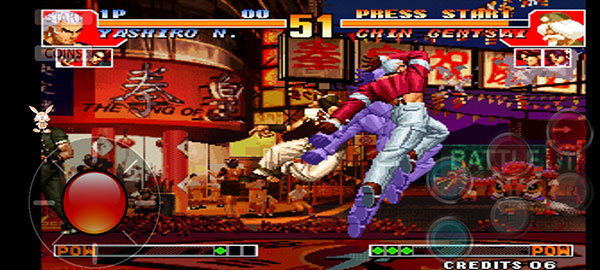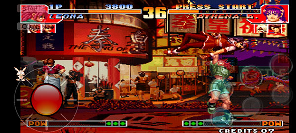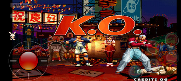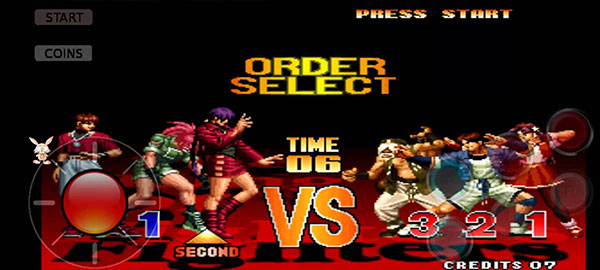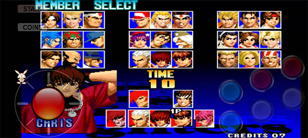 1、下载安装后启动游戏,投币→确认开始→选择心仪格斗家(草薙京、八神庵、不知火舞等经典全员待命)