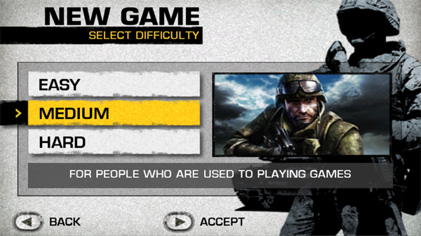启动游戏后,点击「New Game」创建新存档 → 等待加载界面提示“所有数据准备就绪”,确认点击「Yes」→ 在难度选择页根据实战经验选定「中等」(推荐新手)或「困难」模式,点击「Accept」即刻投入战火纷飞的第一线战场。