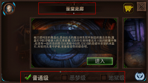 2、在关卡选择界面,明确区分【普通】【噩梦】【地狱】三档难度;请选择【教堂走廊】关卡开启首战挑战。