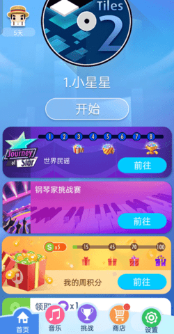 提供经典模式、世界民间、钢琴家挑战、极速模式、无尽模式五大核心玩法,满足不同水平玩家需求:新手可从节奏舒缓的经典曲目入门;进阶玩家可挑战高难度谱面与限时竞速;高手则能冲击全球排行榜,参与定期主题赛事,赢取限定皮肤与成就徽章。