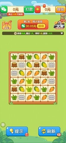 进入游戏点击“开始游戏”,即可直通关卡。系统自动识别相邻相同蔬果(如胡萝卜配胡萝卜、番茄配番茄),轻点即可完成消除;当局面陷入僵局,方块将智能重排,杜绝卡关焦虑。无需记忆规则,3秒理解,1分钟爱上。
