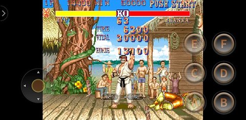 3、以主角隆(RYU)为例——进入对战后,右侧虚拟按键支持连招自由组合,方向键+攻击键精准触发必杀技,真实还原搓招快感;