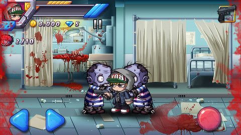 左下角蓝色虚拟摇杆控制角色灵活走位,右侧红色射击键实现即时点射/连发;注意屏幕左右边缘均会刷新僵尸,预判走位是保命关键。