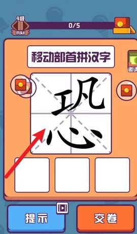 2、长按拖拽汉字部件至中央编辑区,自由组合、旋转、拼接,尝试还原目标汉字或生成新字;