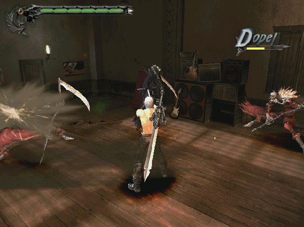 第5关·双子对决 触发剧情后迎战双BOSS——但丁与维吉尔。二者各具风/火双刀形态,血量分两格。电梯旁雕像头为隐藏入口,可触发“秘密任务2”。提示:战斗中合理切换风格应对不同刀势节奏。