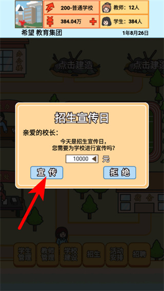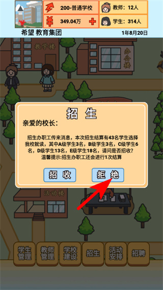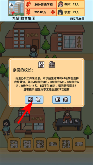 1、点击【招收】按钮启动新生录取,这是扩大办学规模、激活资金流的第一步,及时扩容才能承接后续建设需求;