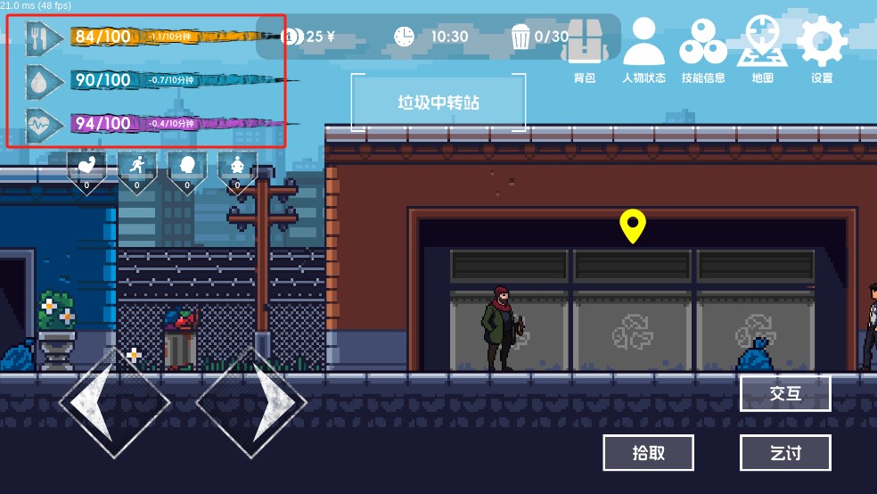 游戏构建了高度拟真的三维生存系统:“饱食度”过低将直接导致游戏结束;“心情”崩塌会触发不可逆崩溃事件;“卫生”则直接影响工作资格——三者随时间持续衰减,且夜间(21:00起)消耗陡增。户外过夜极可能倒下,收容所与廉价宾馆成为保命刚需。所有状态清晰可视化,决策前必须预判行动消耗,而随机事件更会让计划随时翻盘。