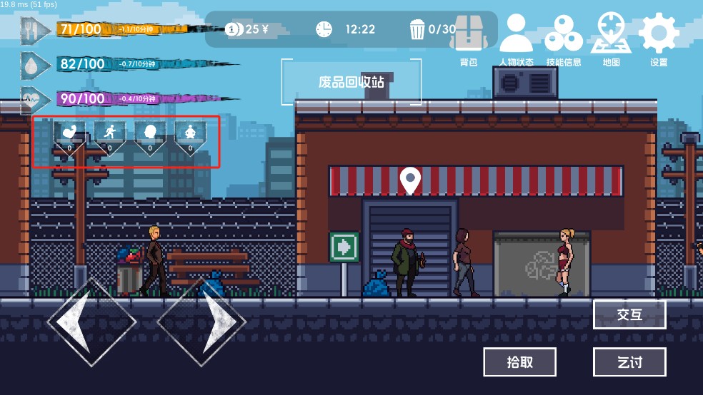 体格、身手、智力、精神四大等级独立成长,每升一级不仅解锁属性加成,更在左上角技能面板随机生成1个可选天赋(全游戏覆盖350+种差异化技能)。打工、互动、探索等日常行为均能积累经验,成长路径完全由你的生存习惯塑造——偏好体力劳动?专注街头观察?或是钻研废品分类?不同侧重将导向截然不同的生存流派。