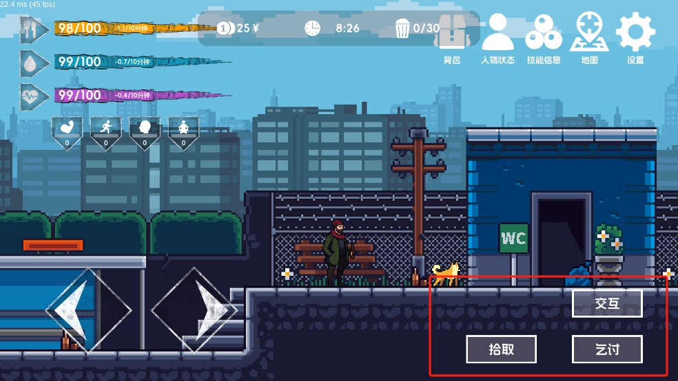 《流浪者2》是一款深度沉浸式像素风生存模拟游戏——你将从零开始,化身一名一无所有的城市流浪者,在冷峻写实的都市图景中挣扎求生。没有主角光环,没有剧情护航,只有实时跳动的饱食度、卫生值与心情指数,以及每日21点准时降临的黑夜威胁。拾荒、乞讨、打工、避寒……每一个选择都影响生存时长,每一项属性提升都需精打细算。这不是一场轻松的冒险,而是一次对韧性、策略与人性微光的持续考验。