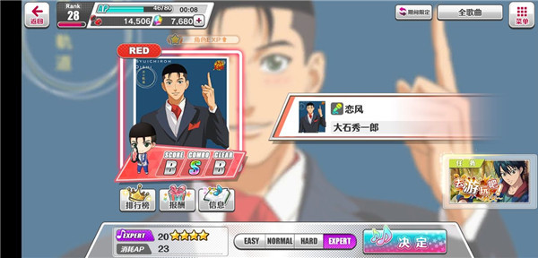 歌曲分「通常/活动/期间限定」三类,每月轮换,当前重点通关大石《恋风》。挑战EX难度时,建议配置「生命恢复」类卡组保底——本作失败不返体力且无奖励,容错率极低。也可启用左下角「自动打歌」(每日5次),虽无连击加分,但经验与材料照常结算。