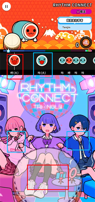 红色音符“咚”击打鼓面,蓝色音符“咔”敲击鼓边,大鼓图标需双手同步重击;连续长条音符则需保持节奏连打;所有操作均适配手机触控特性,响应迅捷、反馈清晰。