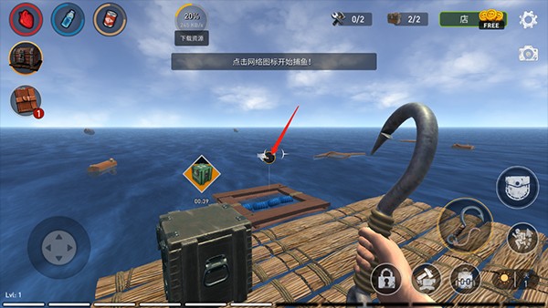 开局即孤身一人,没有教程强制引导,只有直觉与观察力带你入门:点击“开始生存”进入浩瀚海域,通过左下角虚拟摇杆自由移动木筏或潜入水中;滑动屏幕切换第一人称/俯视角,掌控全局动向;发现漂浮物资时,长按钩子图标精准拖拽回收;打开工艺菜单,一步步制作捕鱼网——选择“生产→捕鱼网→创建”,部署后点击网络图标即可自动作业,稳定获取食物来源。所有操作简洁直观,但每一步决策都影响生存节奏与扩展上限。