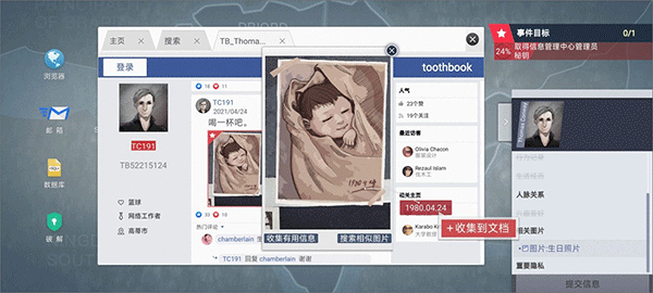 游戏摒弃浮夸设定,深度复刻真实黑客工作流:从浏览器情报初筛、数据库交叉验证、密码生成暴力破解,到社交平台伪装渗透、图片元数据提取、邮件链路追踪——六大核心系统环环相扣,操作逻辑严丝合缝。没有一键黑入,只有步步为营;没有万能外挂,只有信息即武器。