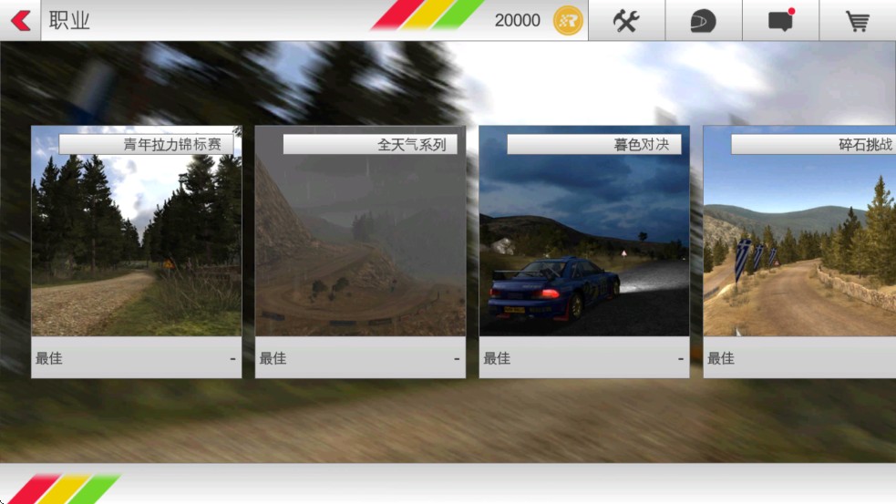 主界面选择【职业模式】,开启你的拉力生涯——这是最完整、最具成长性的核心玩法,包含多国分站、赛季积分与车辆研发线。