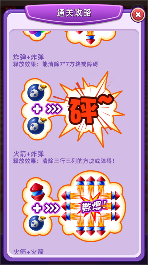 炸弹 + 炸弹 → 7×7超大范围清除,专克密集障碍群;火箭 + 炸弹 → 精准打击三行三列交汇区域,高效拆解关键节点;