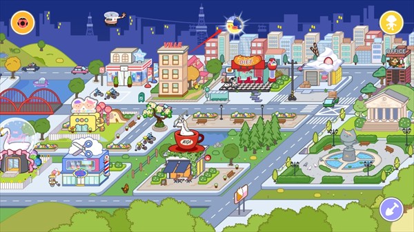 游戏构建了一个完整、可交互的立体小镇世界,包含多个主题建筑与动态场景。白天阳光明媚,夜晚星光点点——轻点屏幕中的太阳或月亮图标即可一键切换昼夜模式,感受不同时段的独特氛围与隐藏互动。