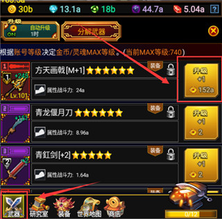 灵魂强化——全场景通用的核心成长线!进入武器详情页→点击“灵魂强化”,消耗灵魂材料提升。同样每100级解锁1个灵魂被动(共9个)。其强化等级(青色数字)覆盖黑矿山、竞技场、迷宫等所有玩法,是中后期战力锚点。