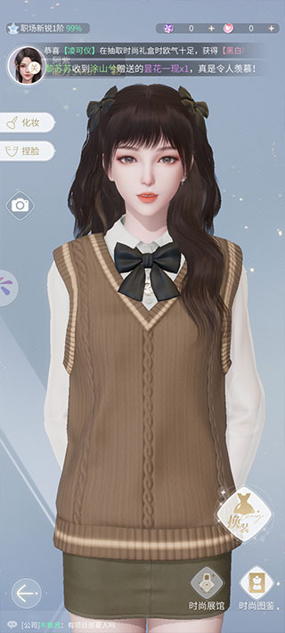 3、打造理想人设:点击左下角“人物”,自由切换换装、化妆、时尚图鉴模块——搭配战袍、精修五官、追踪套装收集进度,为第一天上班做好万全准备;