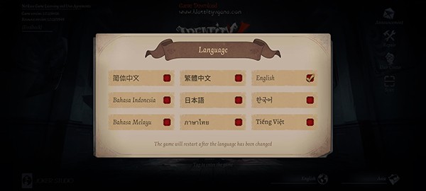 1、首次启动后自动下载必要资源,加载完毕进入主界面,点击右下角“English”切换语言选项;
