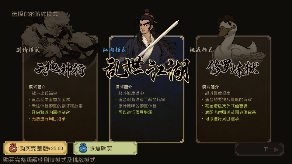 《大江湖之苍龙与白鸟》是一款以南宋乱世为背景、融合高自由度沙盒探索与策略战棋战斗的像素风中式武侠RPG。在这里,你不是旁观者,而是亲手执笔的江湖执笔者——从乞丐、孤儿到放羊娃,出身由你定义;习剑、修音律、练暗器或悟禅宗指法,武学之路任你抉择;结义豪侠、攀附权贵、快意恩仇或独善其身,70万字多线叙事将每一次选择都化作不可逆的江湖烙印。这不是一场预设结局的冒险,而是一方真正属于你的、有呼吸、有温度、有因果的活态武侠世界。