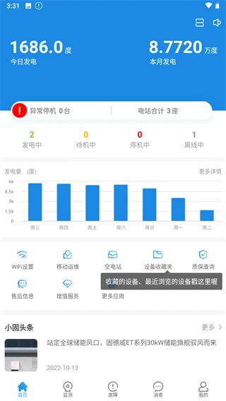 【主动故障告警】设备异常、通信中断、发电偏低等20+类故障自动识别并推送消息中心,附带故障码解读与处理建议,抢修响应快人一步。
