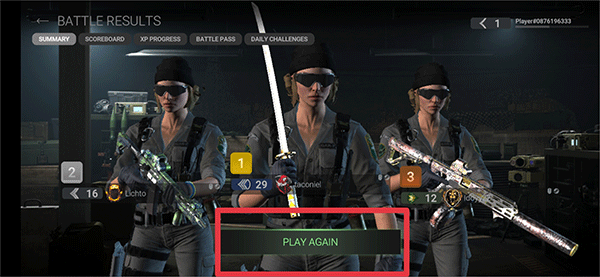 4、战后即时查看KD比、伤害输出、MVP评定等详细数据,并一键【Play Again】续战不中断;