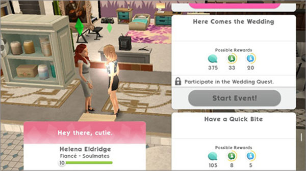 2、当两位Sim亲密度达到8级,对话框将浮现「Here comes the wedding!」提示,此时任务栏自动激活限时婚礼筹备任务。
