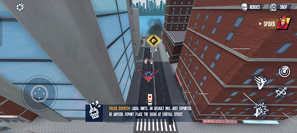3、【蛛丝荡跃】是灵魂操作!长按右下角「蛛丝键」发射蛛丝吸附建筑,松开瞬间自动回缩产生拉力;配合方向键微调角度,即可实现360°自由摆荡、空中转向、飞跃断桥——这才是真正的「蜘蛛感」!