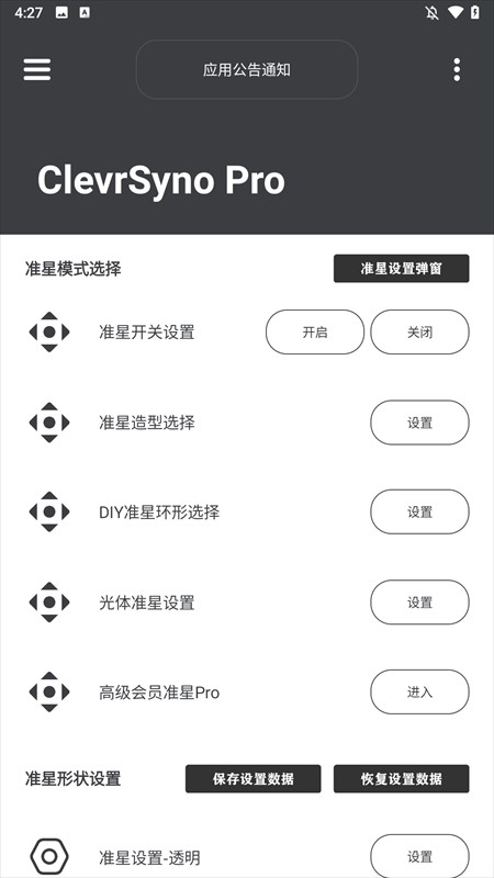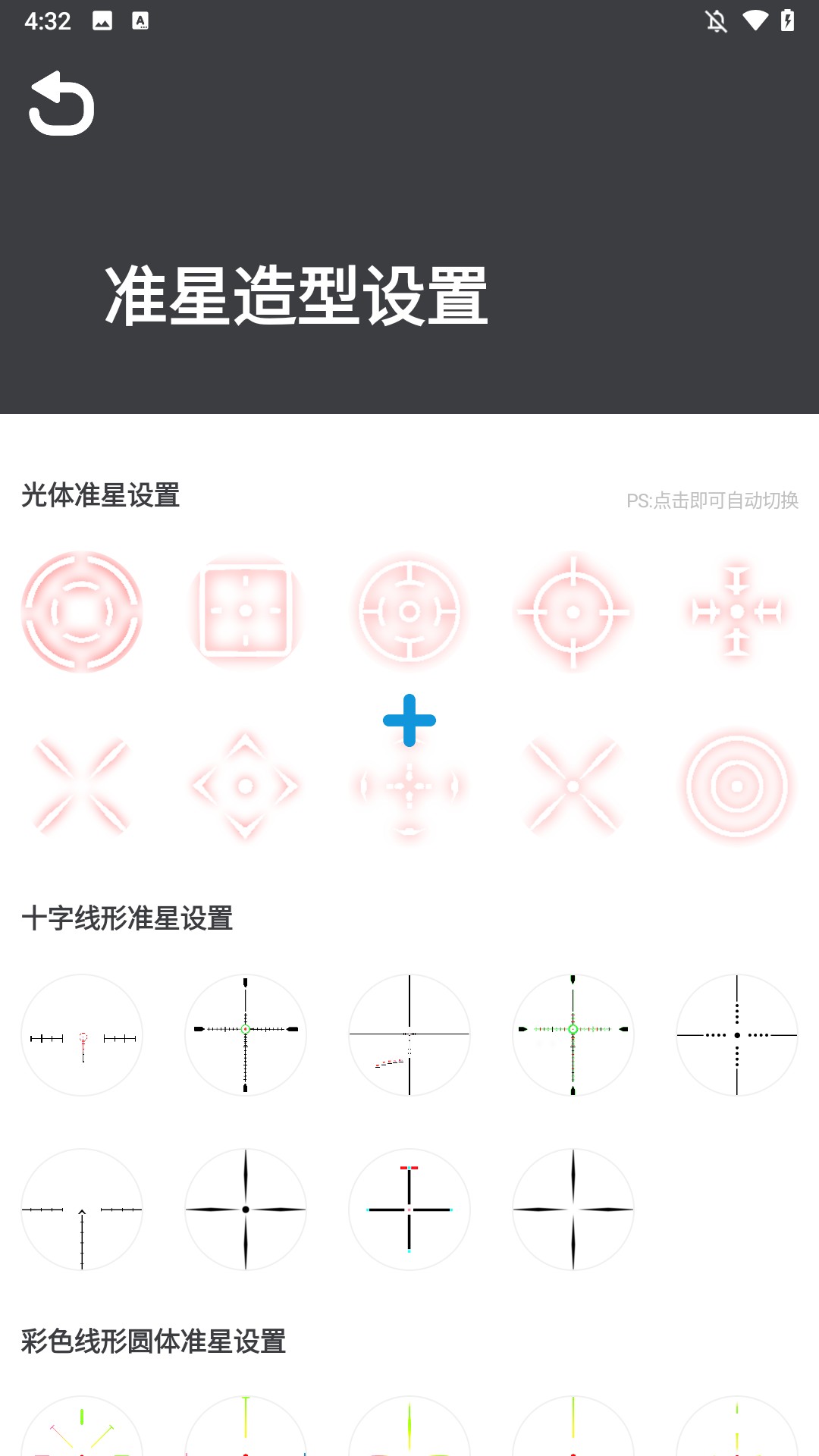 3、浏览内置20+专业预设准星(经典十字、靶心环、动态呼吸式、狙击镜分划等),一键切换