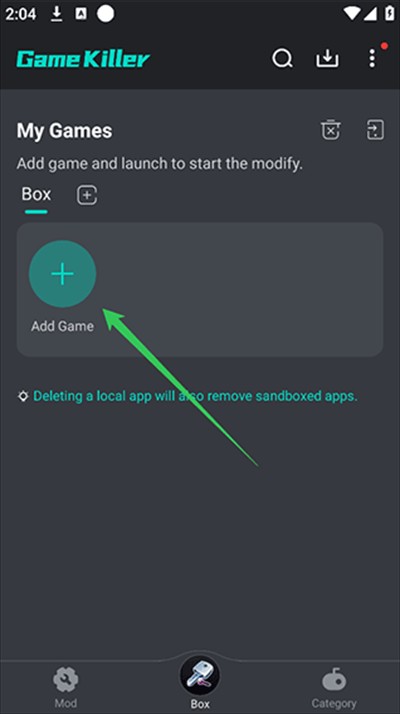 1、打开Game Killer,进入沙箱管理界面,点击【添加游戏】按钮