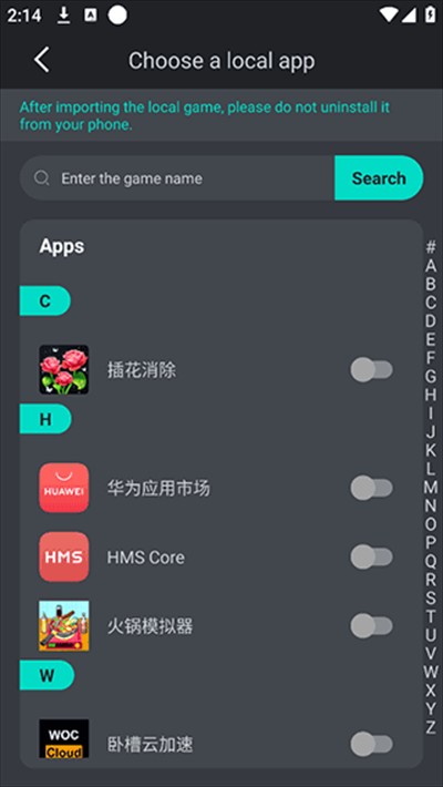 2、从已安装应用列表中选择目标游戏,自动加载进程并启动内存扫描