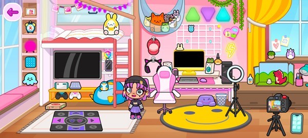 在这里,穿搭只是起点——你可以随心布置卧室、打造梦幻树屋、设计主题派对现场,甚至用数百种家具、装饰物和动态道具(如旋转灯、会跳动的沙发、飘雪特效窗)构建独一无二的生活空间;所有场景均可自由缩放、旋转、组合,所见即所得。