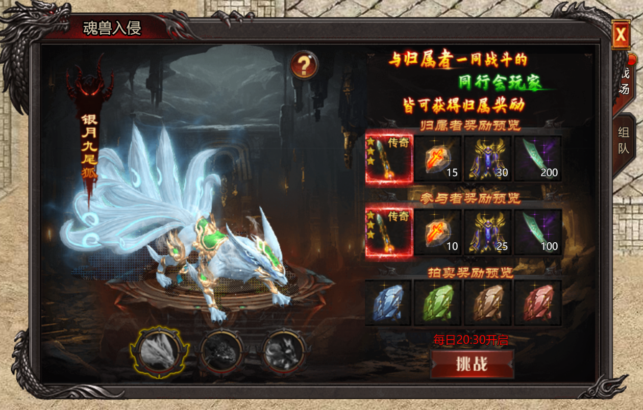 开服第2天起,每日20:30准时开启【跨服入侵】!沙巴克攻城期间暂停,其余时间火力全开。每位玩家限入一张地图,行会可协同布阵;击杀归属者即可抢夺怪物归属权,大幅提升本行会奖励概率!归属者及同会成员获归属奖励,其他行会成员享参与奖励——高策略、强对抗、快节奏,真正考验指挥力与执行力!