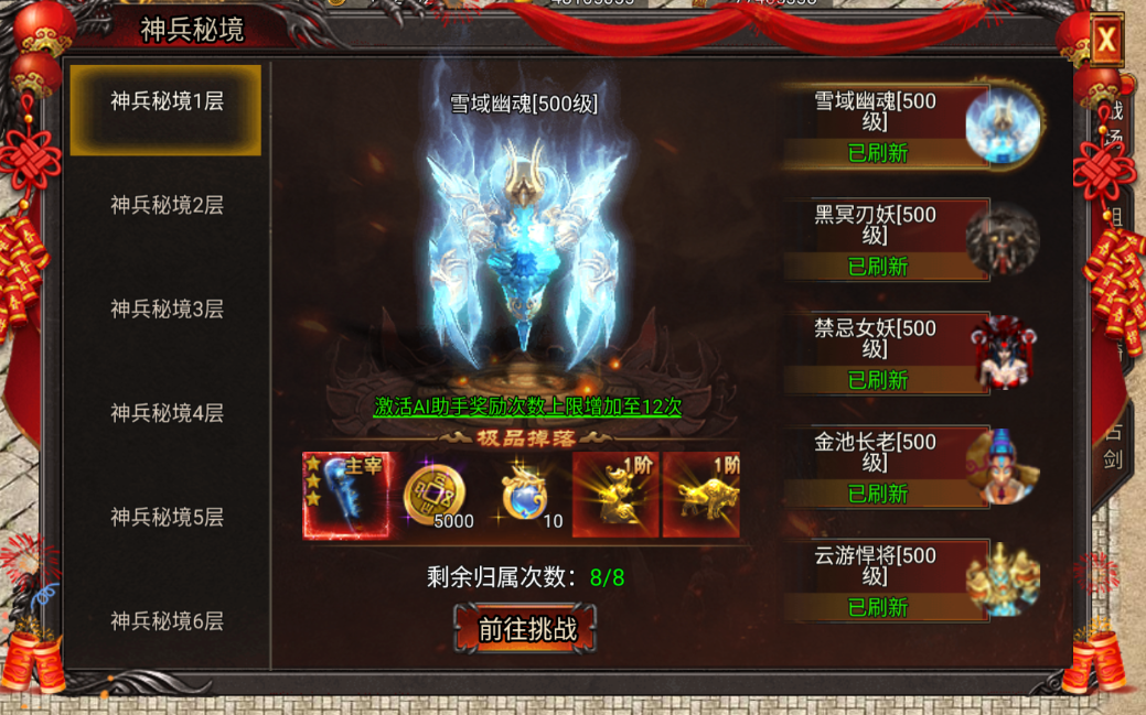 开服第8天跨服开启!暗殿共设4层(后续版本已拓展至5层),每层对应独特属性门槛:日之力、月之力、星之力、辰之力、暗之力缺一不可。达标方可挑战当层BOSS,击败后独享归属奖励——暗殿装备直接掉落!每日2小时恢复1次挑战次数,最多累计5次,策略配装+精准突破,才是登顶关键。