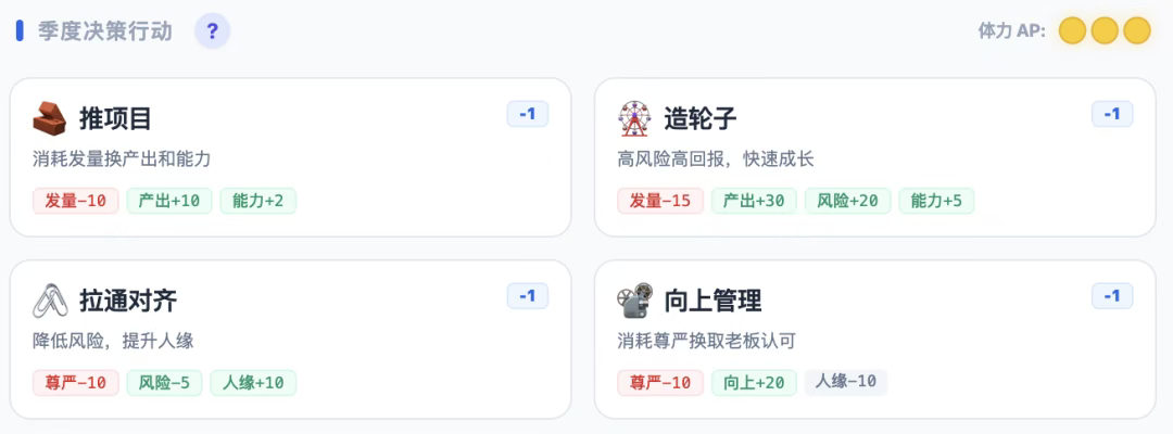 人生被精准切割为季度单位,每个季度仅限三次关键行动——推进项目、向上管理、带薪摸鱼……所有选择均实时反馈至七维数值,悄然改写职业轨迹。