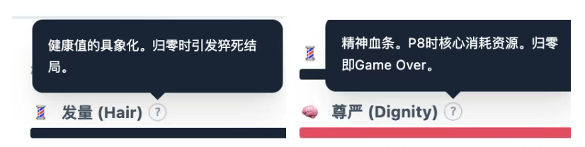 1.生命归零:发量归零触发ICU/猝死结局;尊严值耗尽则导向抑郁/自杀结局。