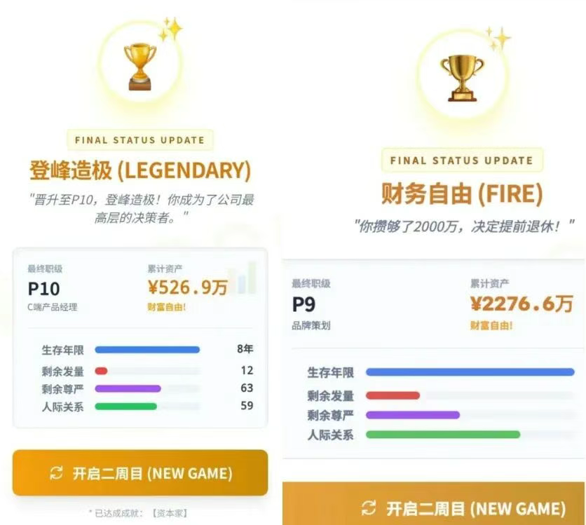2.财务自由:账户现金累计达2000万元,即可主动退休通关,彻底告别职场内耗。