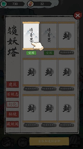 进入锁妖塔后,通过“幻化”功能生成适配不同修为等级的修炼怪物。