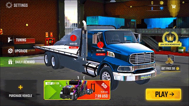 启动游戏后,在主标题界面点击“Play”,即可进入模式选择页;随后选择“Free Play”免费模式,在右侧地图列表中选定目标区域,确认后点击“Play”即刻开启你的卡车生涯。