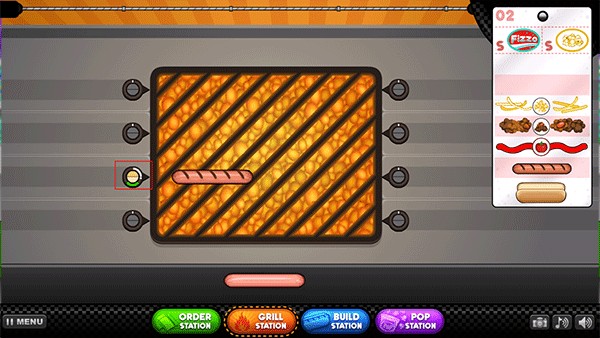 先将香肠放入烤炉烘烤;紧盯左侧状态指针——当颜色转为橙色时及时点击翻面,避免焦糊。