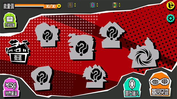 首页清晰展示能量值、基因量、关卡进度与晶石植入模块;消耗基因量可强化晶石属性,点击“街道”第一关即可开启探索之旅,确认后即刻进入战斗场景。