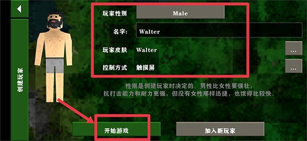 角色生成后,支持即时调整性别与初始服装;完成设定即刻点击“开始游戏”进入沙盒世界。