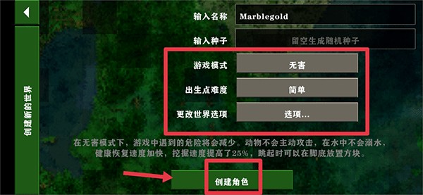 设置世界名称、游戏模式(如生存/挑战)、出生点难度及高级选项,确认无误后点击“创建角色”。
