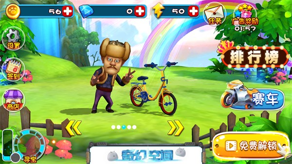 熊出没奇幻空间是一款基于热门国产动漫IP《熊出没》深度打造的3D竖屏赛车竞速手游。游戏巧妙融合跑酷与竞速机制,玩家将操控光头强、熊大、熊二等经典角色,在奇幻场景中高速驰骋,灵活闪避障碍、精准收集金币,并持续升级载具——从自行车、摩托车到飞行器,解锁更多速度与乐趣。