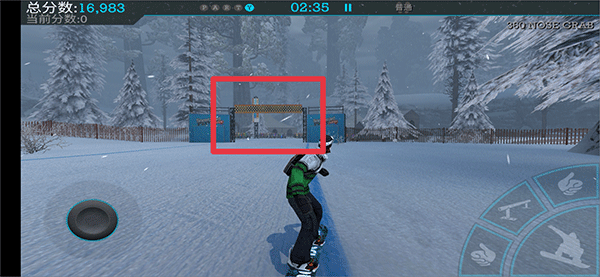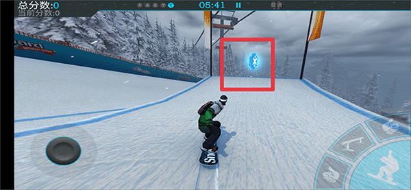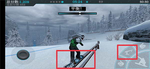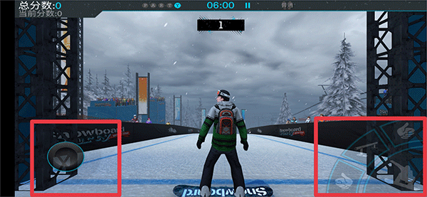 正式滑行时,左侧虚拟轮盘控制方向与速度(含前进/刹车),右侧四个功能键对应不同特技姿势指令。