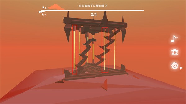 第四关:先剪断左上与右下两个顶点处的绳索;再切换至后方视角,迅速剪断左侧相邻的两根绳索(注意操作节奏);完成后触发校验,校验通过即解锁下一关卡。
