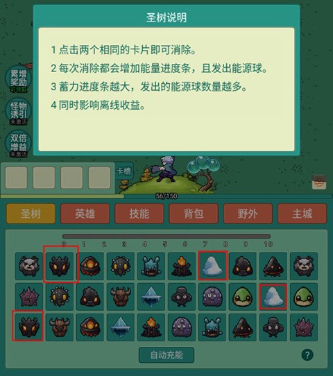 圣树是前期输出关键:角色初始伤害偏低时,手动消除同色圣树可快速充能,激活“自动充能”后刷图效率与资源收益显著提升。