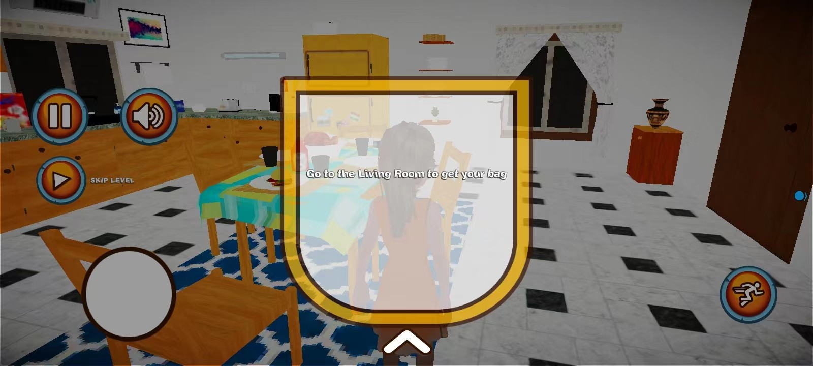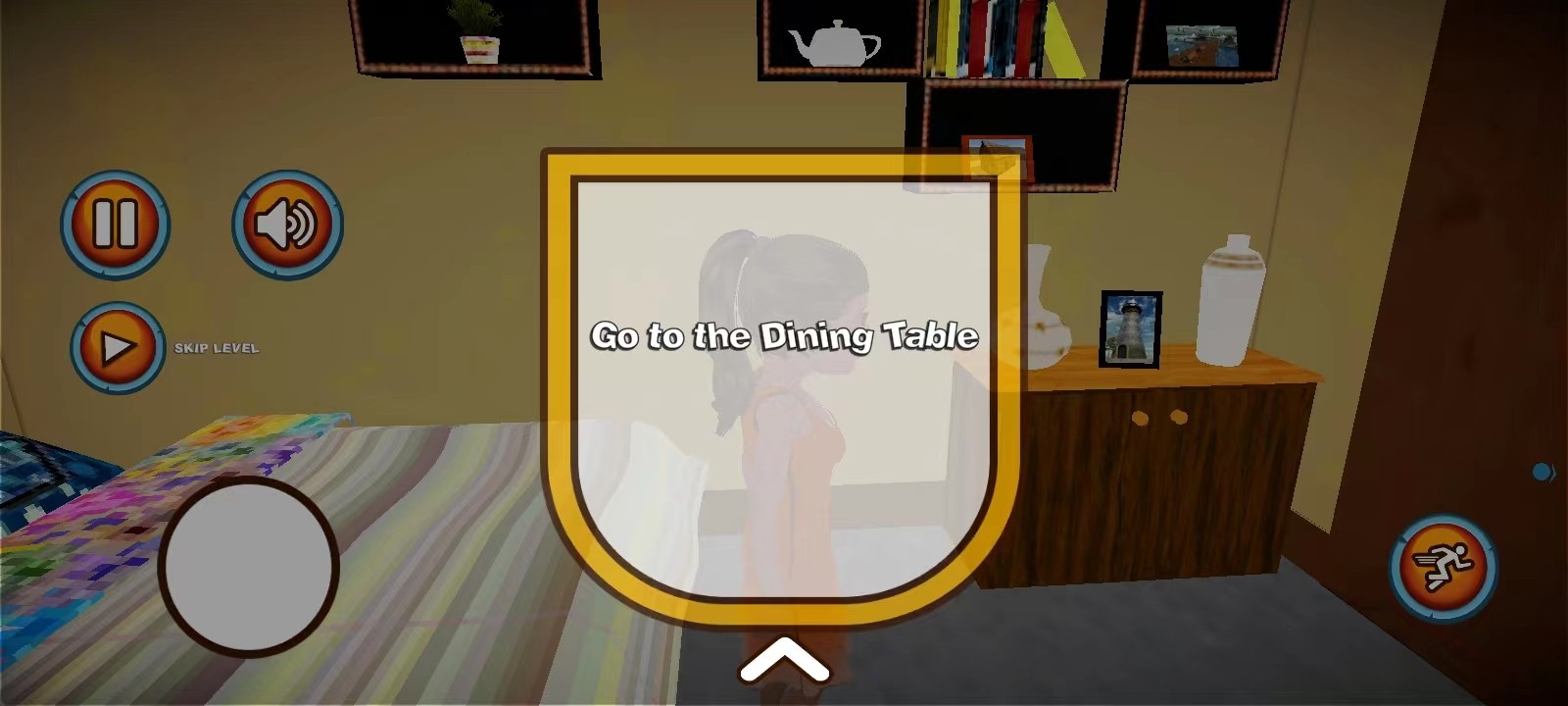 第五步:操控角色——左侧虚拟摇杆控制移动,右侧按钮触发加速;首个任务提示为“前往餐桌”,可依据界面右上角蓝色导航点自动寻路;
