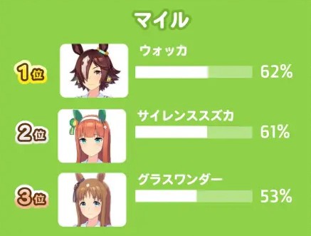解析:沙地适配马娘本就稀缺,神鹰以95%超高出场率稳居榜首;小栗帽达83%,人气马娘春丽乌拉拉亦保留在榜。