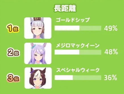 解析:樱花进王与帝王光辉持续领跑短距赛场,出场率稳居前列。其中樱花进王作为平民首选逃马,是多数玩家首只达成URA成就的马娘。